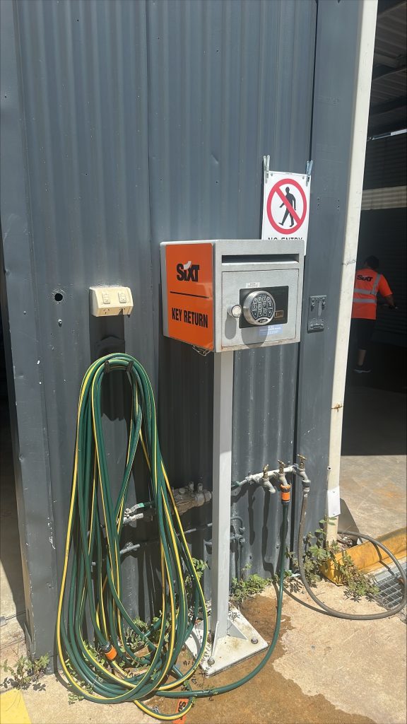 - Park the vehicle inside the yard and locate the Key Return Box. This is located at the back of the location, beside the vehicle wash bay. Please refer to the picture below to assist.