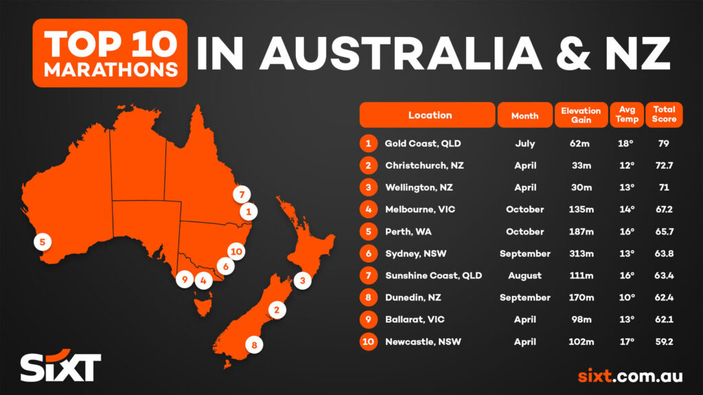 To determine the easiest and most comfortable marathon courses in Australia and New Zealand, we developed a weighted scoring system based on seven key factors. Elevation gain, temperature, humidity, fastest time, altitude and popularity indicators – participants and Instagram mentions. To determine ranking, each marathon was given a score out of 100.